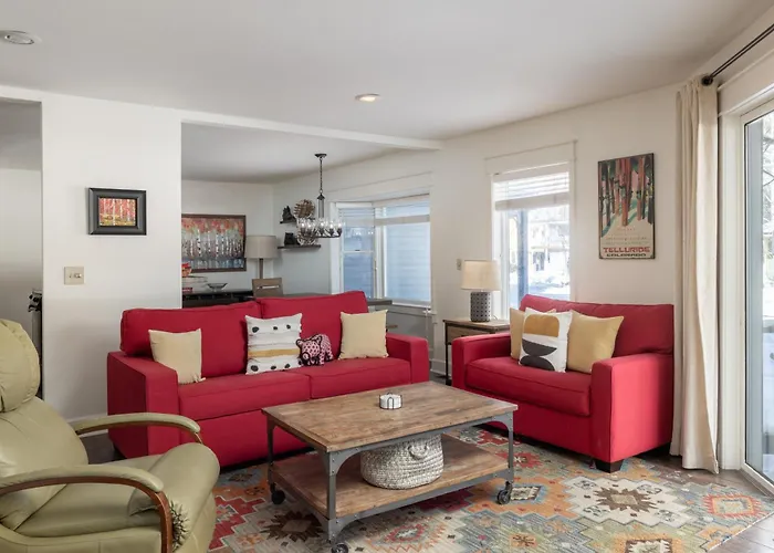 O Smuggler Mine - Modern Pet Friendly Retreat Near Slopes Apartamento possui cozinha equipada equipada com forno e máquina de lavar loiça. O aeroporto mais próximo é o aeroporto em Telluride, a 5 km do Smuggler Mine - Modern Pet Friendly Retreat Near Slopes Apartamento em Telluride.